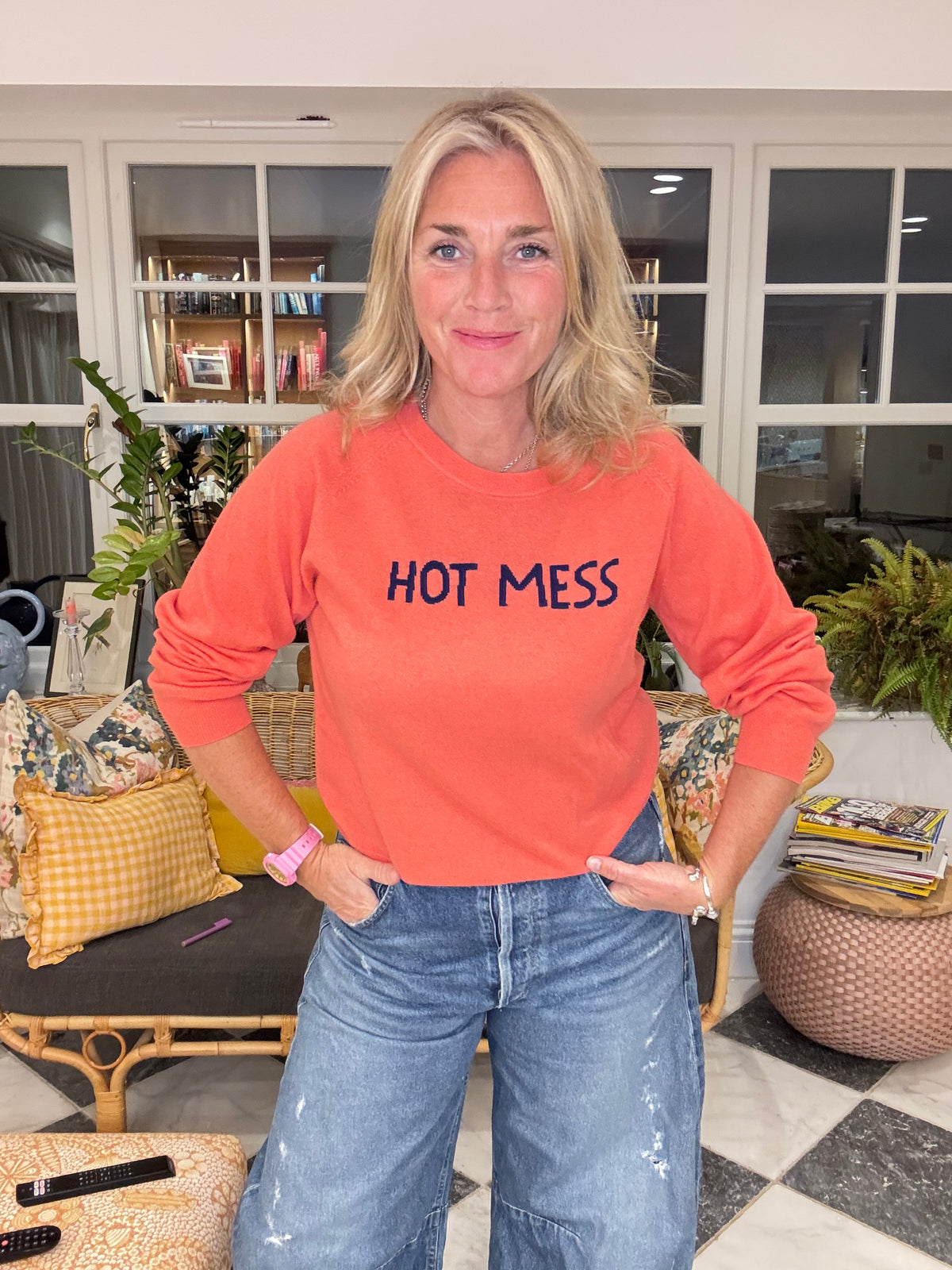 Our Hot Mess knit is here! Totally gorgeous in a bright coral colour with navy writing, it's the perfect piece to take you into Autumn. 90% wool, 10% cashmere, it's as soft as butter.