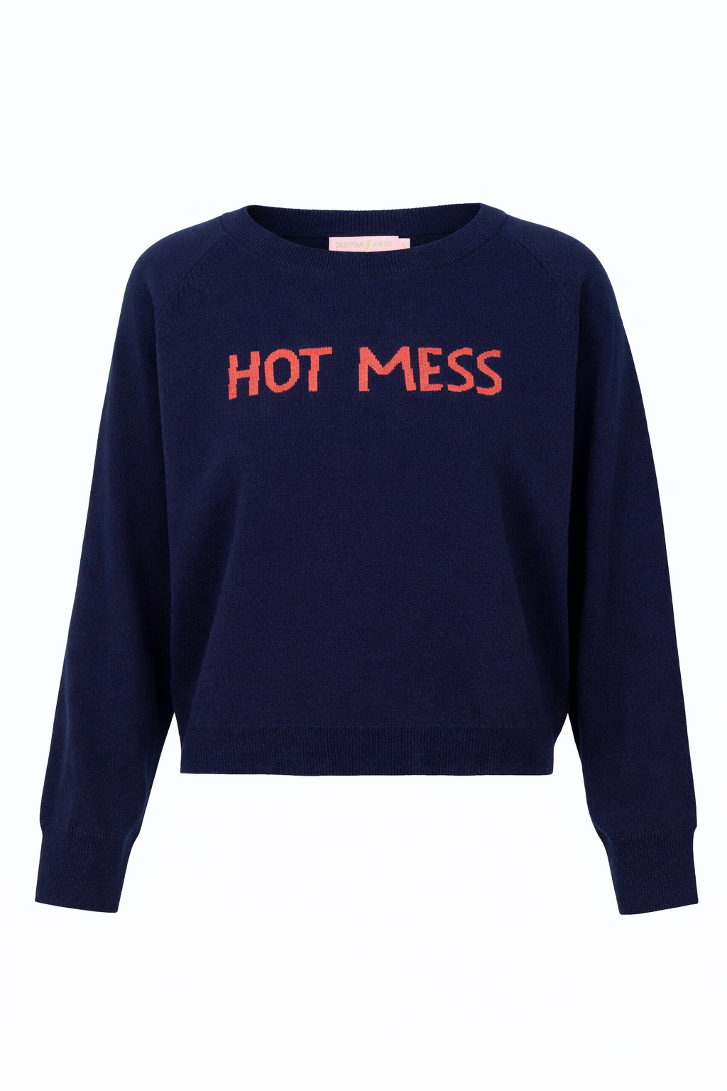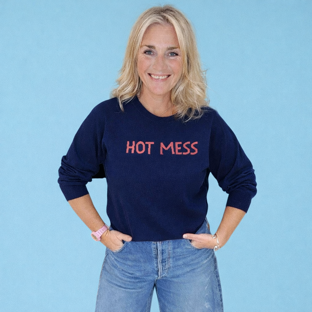 Our best selling Hot Mess knit is back in a second colour way - we reversed it! A navy base with coral writing.
